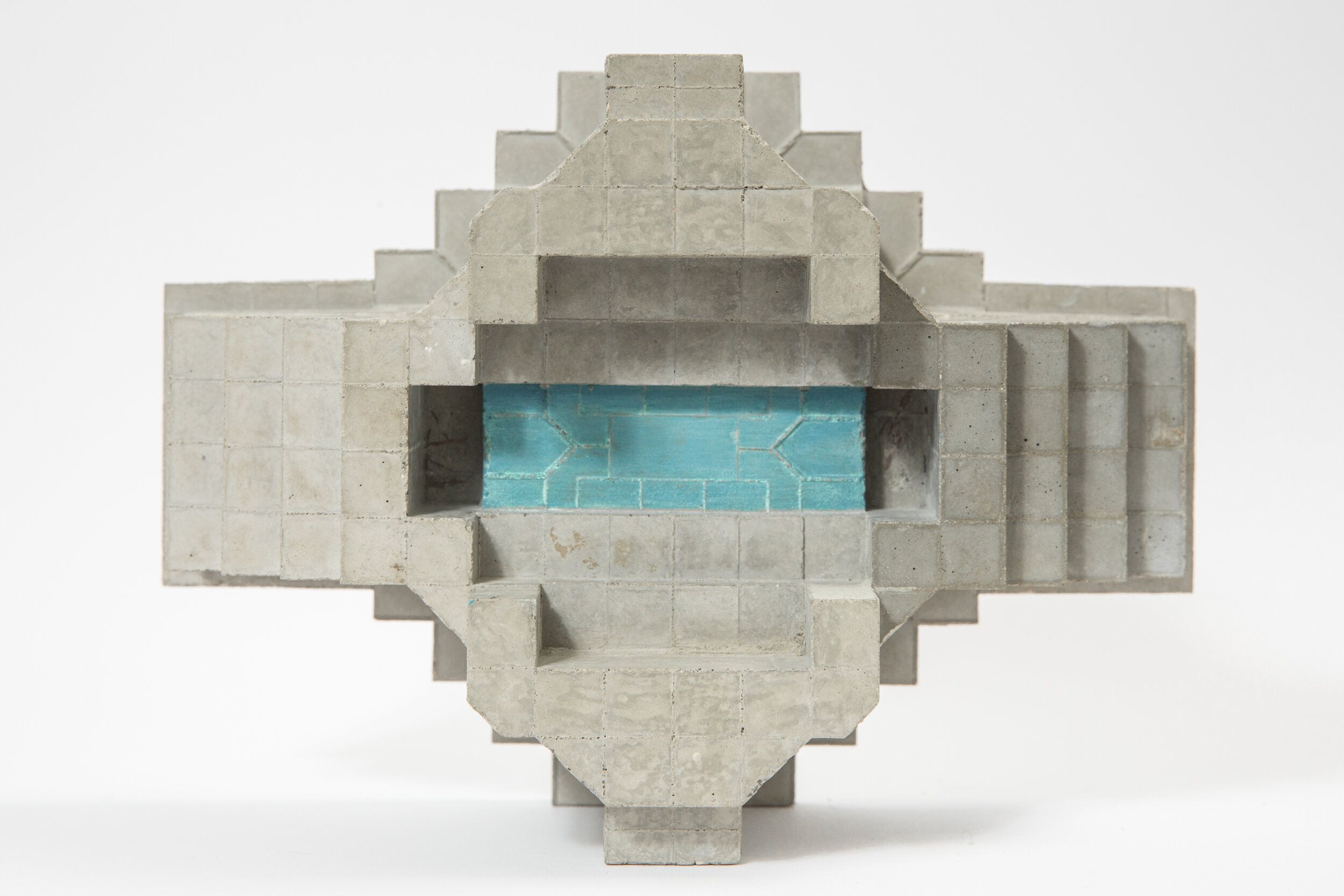 Her small-format concrete sculptures from the “Artefacts” series consist of individually cast parts, mostly two or three elements, which the artist combines together following the principle of trial and error. Piotter discovers spatial solutions by trying out possible combinations. She is guided by her fascination for brutalist buildings and the unfinished. By combining solid parts and filigree transitions, she sometimes creates an impression of flawedness in her objects, which resemble building site ruins; they were never finished and now they are. Many of the sculptures can be set up in at least two different ways, providing multiple perspectives on the object, made possible by the object itself. The partial colour design of the sculptures plays with the visible and the invisible, and illustrates the multi-dimensionality of the work.